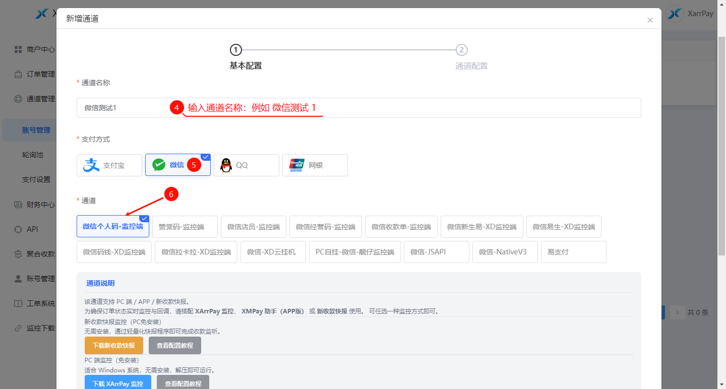 本文介绍如何在 XArrPay 平台中配置 微信个人收款码通道,并通过 新收款快报 实现收款自动上报。请配合文中步骤编号对应的截图操作。