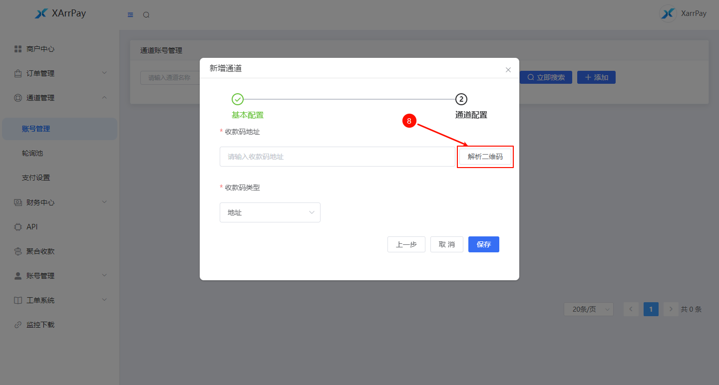 在 XArrPay 后台添加微信个人码通道:填写基本信息 → 解析收款二维码 → 选择收款码类型为“地址” → 保存。