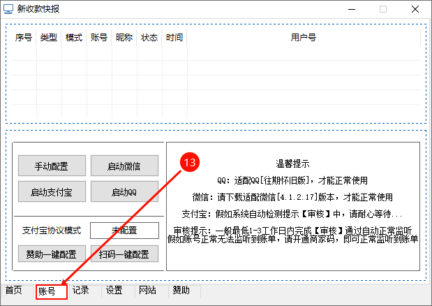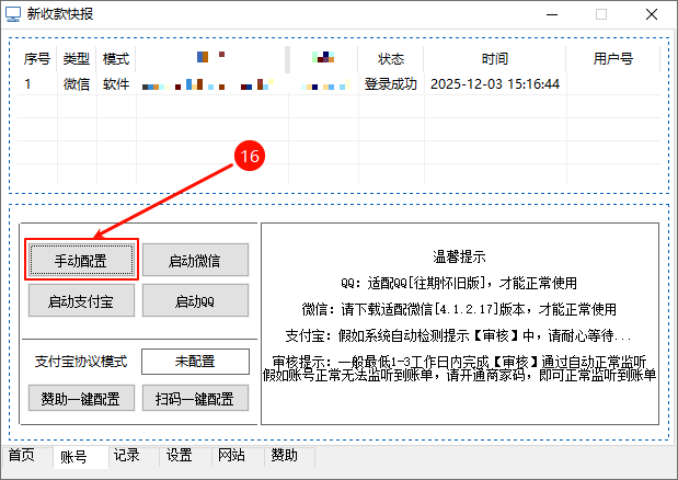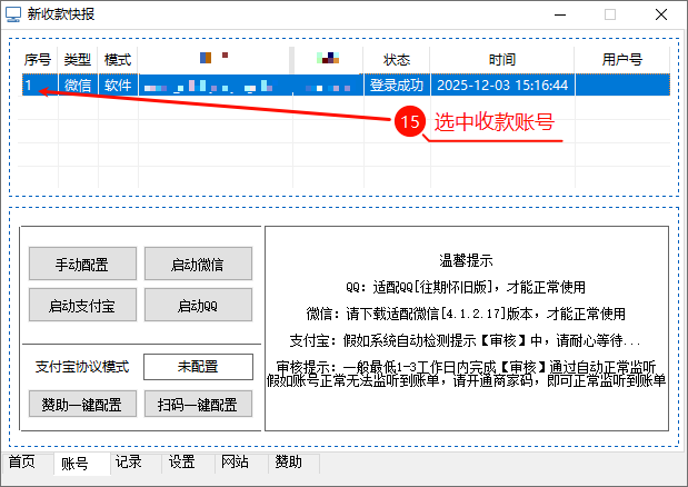在新收款快报中登录收款微信:打开账号页 → 启动微信 → 选中账号 → 手动配置。