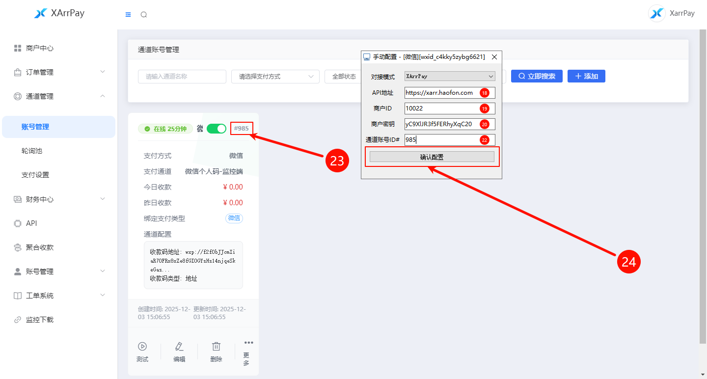 保存成功后,在通道列表中可以看到刚刚添加的微信通道卡片,其中会显示通道 ID(例如:#985)、收款码地址、今日/昨日收款等信息(标号 23)。后续在新收款快报中需要用到这个通道 ID。