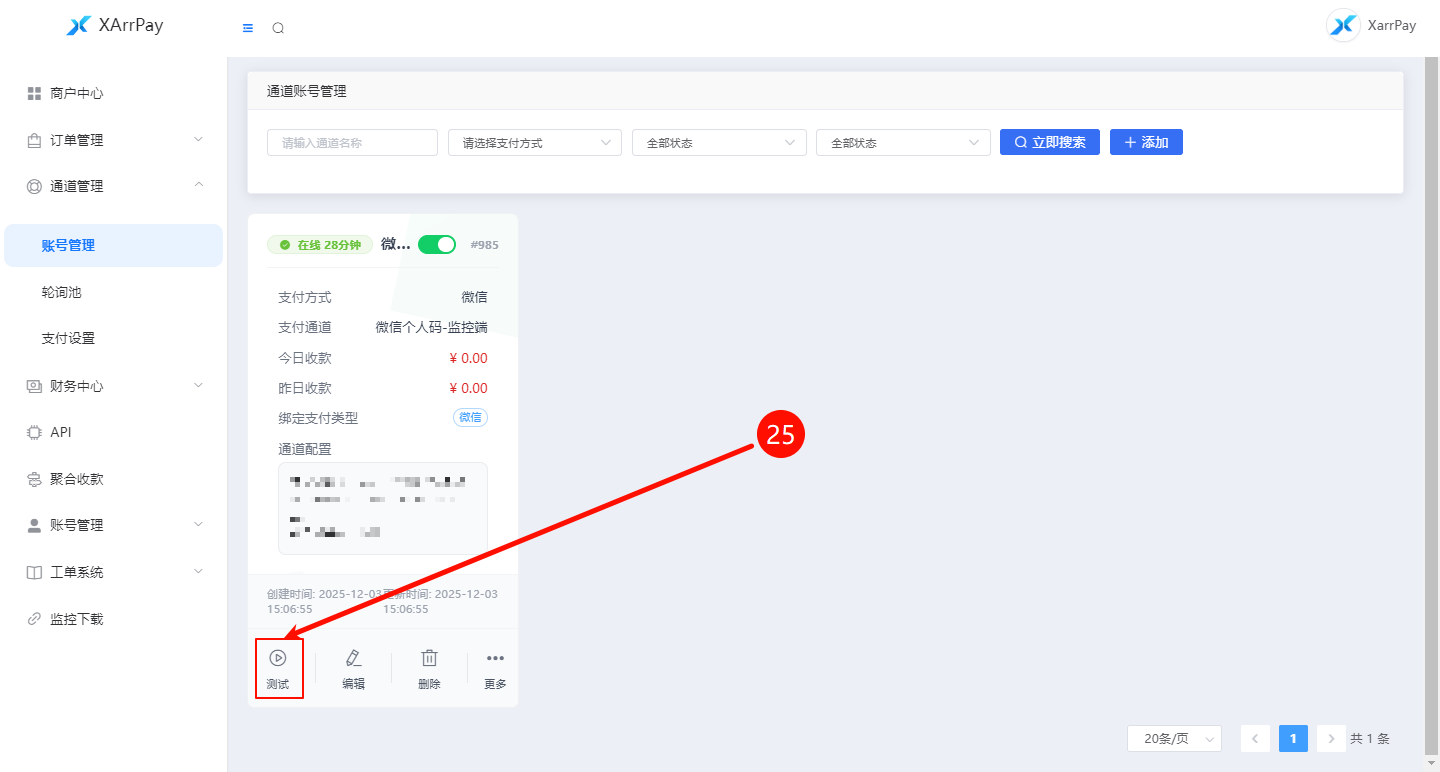 在刚刚配置好的微信通道卡片左下角,点击 「测试」 按钮(标号 25)。