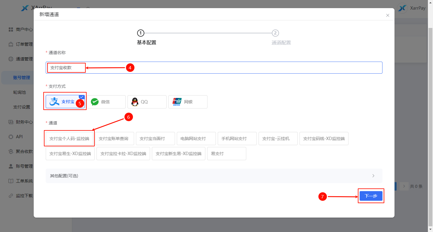 在「通道」区域选择 支付宝个人码-监控端(标号 6)。