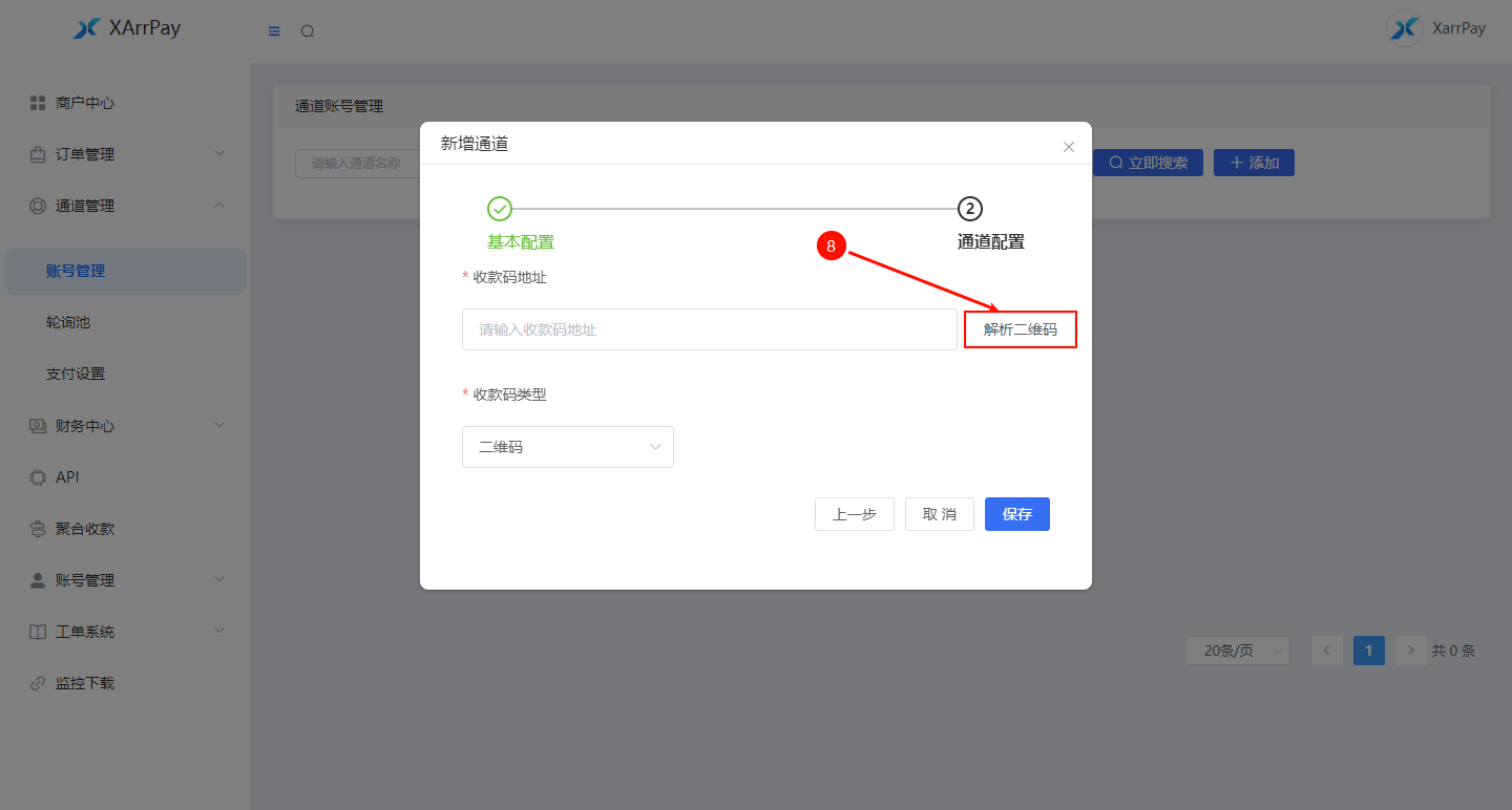 在 通道配置 页面中,点击「收款码地址」右侧的 「解析二维码」 按钮(标号 8)。