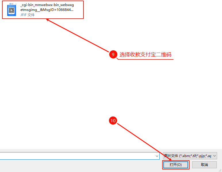 在弹出的本地文件选择窗口中,选中你之前保存的 支付宝收款码图片(标号 9),然后点击右下角 「打开」(标号 10)。