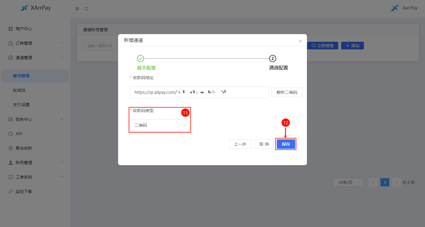 点击右下角 「保存」(标号 12),完成该支付宝收款通道的创建。