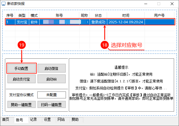 在账号列表中,点击刚刚登录成功的那条记录,使其高亮选中(标号 18)。